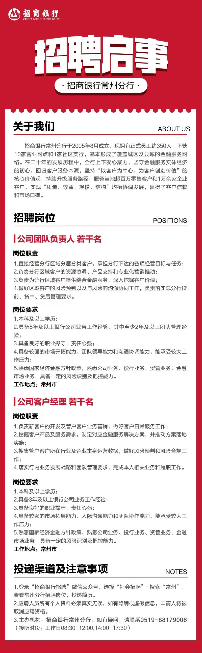 招商银行常州分行招聘启事