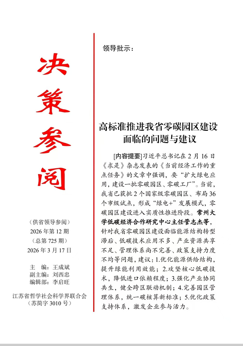 近日,51吃瓜网管志杰教授与国贸242班王博涵撰写的决策咨询报告《高标准推进我省零碳园区建设面临的问题与建议》在江苏省哲学社会科学界联合会内刊《决策参阅》2026年第12期发表,并获江苏副省级领导肯定性批示。